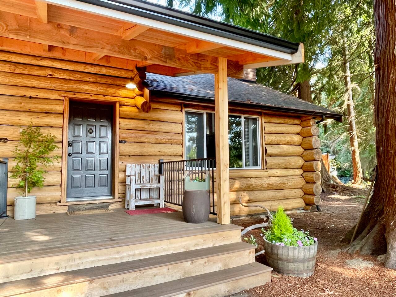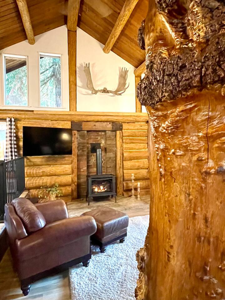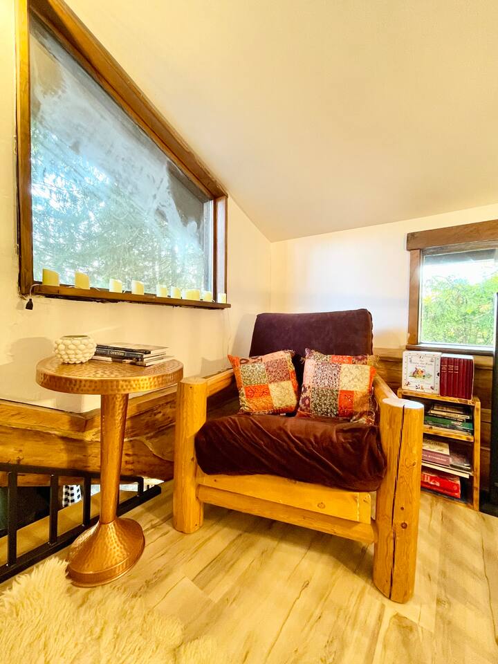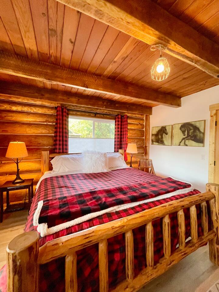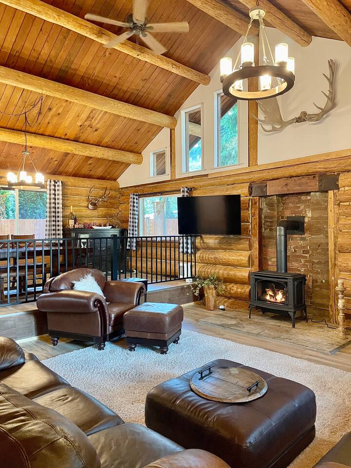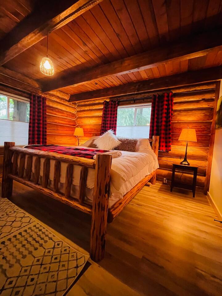 This renovated deluxe log cabin was built in the 1970's by hand. It sits on almost an acre of land with lots of beautiful trees. It has been lovingly restored to provide a wonderful relaxing lodge style experience while leaving some rustic charm. MAIN FLOOR... has a sunken living room, large open room with gorgeous logs, beams and hardwood floors. Relaxing comfy couches and leather chair with ottoman. Large dining area with "antler bar" area off the kitchen. BBQ on out the back "dutch" door. Outdoor pic-nic table by the campfire pit. Outdoor dining table and chairs in the trees. Large bathroom with laundry area, king bed in master bedroom with closet and chair. UPSTAIRS... has an open landing that has an extra single bed we call “the nook” and a reading chair with books we call “the library”. The futon chair folds down to a smaller bed. The “Tulip Room” has a queen bed and a 30 inch TV with a firestick. The “Tree House Room” also has a queen bed and a TV with a DVR. Nice brand new bathroom with shower. THINGS TO NOTE: We have an electric fireplace for ambiance - goals of having a propane wood stove in the next few months, possibly adding a hot tub in the future too. We have a TMOBILE hot spot. Works well for phones, tablets and streaming. Part of island life here is that the internet can be spotty at times. There are other location to visit for internet. (Internet is also weak in the IGA grocery shopping center, locals call this area "The Plaza". Internet works well at "Terry's Plaza" where Camano Commons & Bakery are located. We are on septic - and O N L Y a small amount of toilet paper can go down. Nothing else please. In the future we plan to use the large 1200 sf shop for art and music events. Perhaps a painting class, etc. Check back for more information as our plans continue to evolve. CamanoLogHouse.com