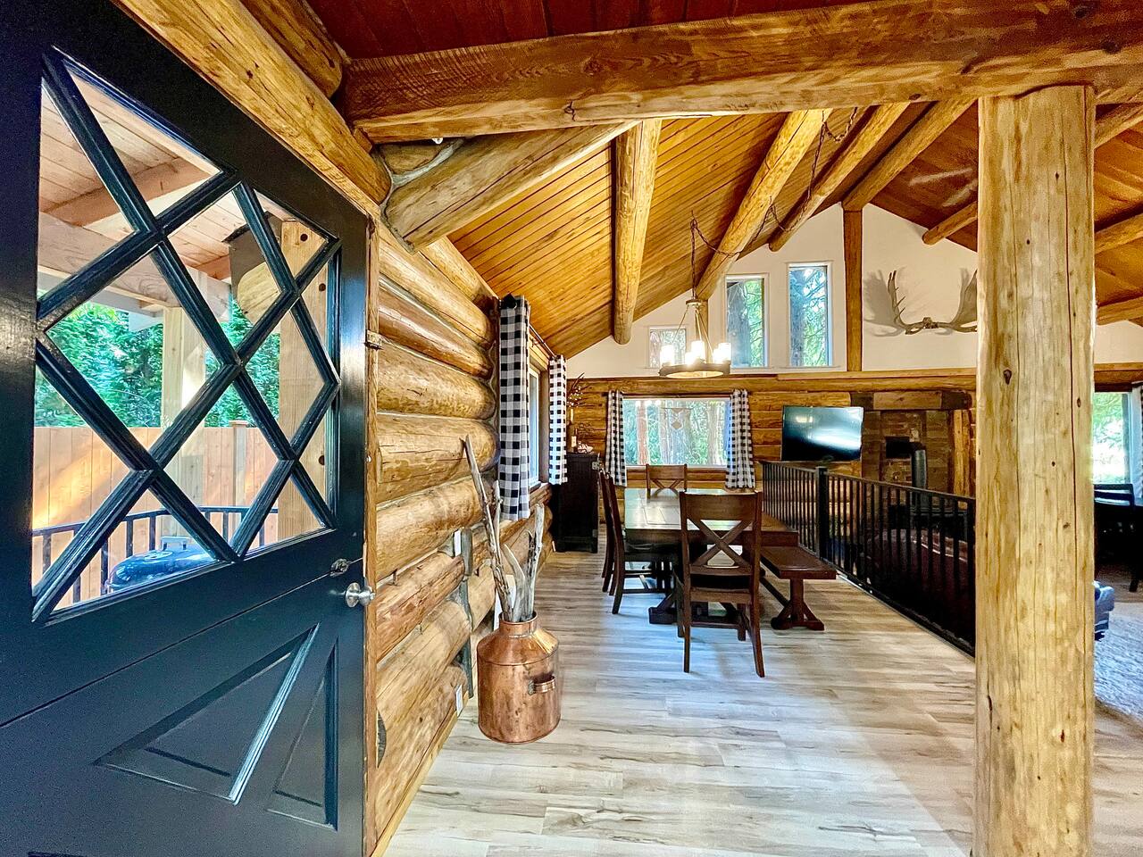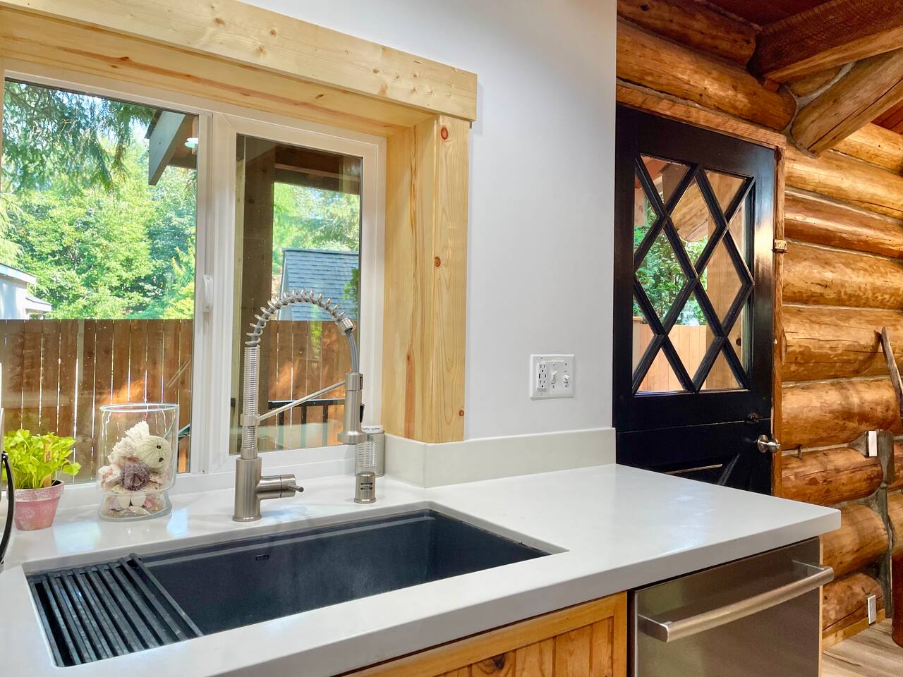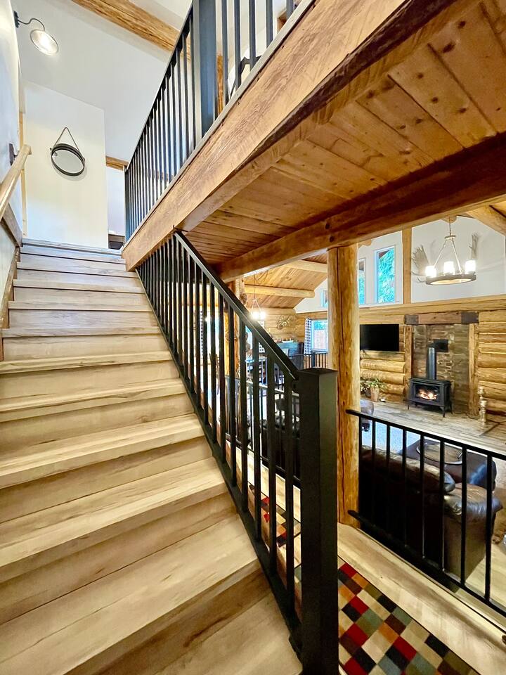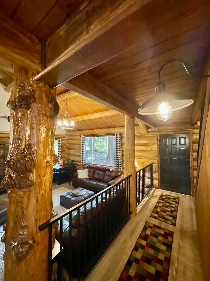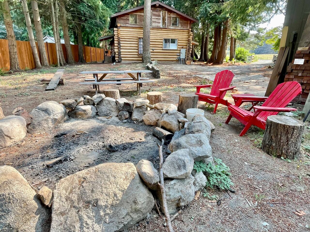 This renovated deluxe log cabin was built in the 1970's by hand. It sits on almost an acre of land with lots of beautiful trees. It has been lovingly restored to provide a wonderful relaxing lodge style experience while leaving some rustic charm. MAIN FLOOR... has a sunken living room, large open room with gorgeous logs, beams and hardwood floors. Relaxing comfy couches and leather chair with ottoman. Large dining area with "antler bar" area off the kitchen. BBQ on out the back "dutch" door. Outdoor pic-nic table by the campfire pit. Outdoor dining table and chairs in the trees. Large bathroom with laundry area, king bed in master bedroom with closet and chair. UPSTAIRS... has an open landing that has an extra single bed we call “the nook” and a reading chair with books we call “the library”. The futon chair folds down to a smaller bed. The “Tulip Room” has a queen bed and a 30 inch TV with a firestick. The “Tree House Room” also has a queen bed and a TV with a DVR. Nice brand new bathroom with shower. THINGS TO NOTE: We have an electric fireplace for ambiance - goals of having a propane wood stove in the next few months, possibly adding a hot tub in the future too. We have a TMOBILE hot spot. Works well for phones, tablets and streaming. Part of island life here is that the internet can be spotty at times. There are other location to visit for internet. (Internet is also weak in the IGA grocery shopping center, locals call this area "The Plaza". Internet works well at "Terry's Plaza" where Camano Commons & Bakery are located. We are on septic - and O N L Y a small amount of toilet paper can go down. Nothing else please. In the future we plan to use the large 1200 sf shop for art and music events. Perhaps a painting class, etc. Check back for more information as our plans continue to evolve. CamanoLogHouse.com