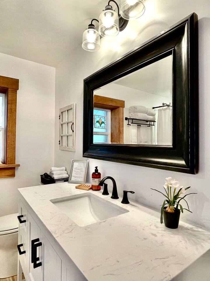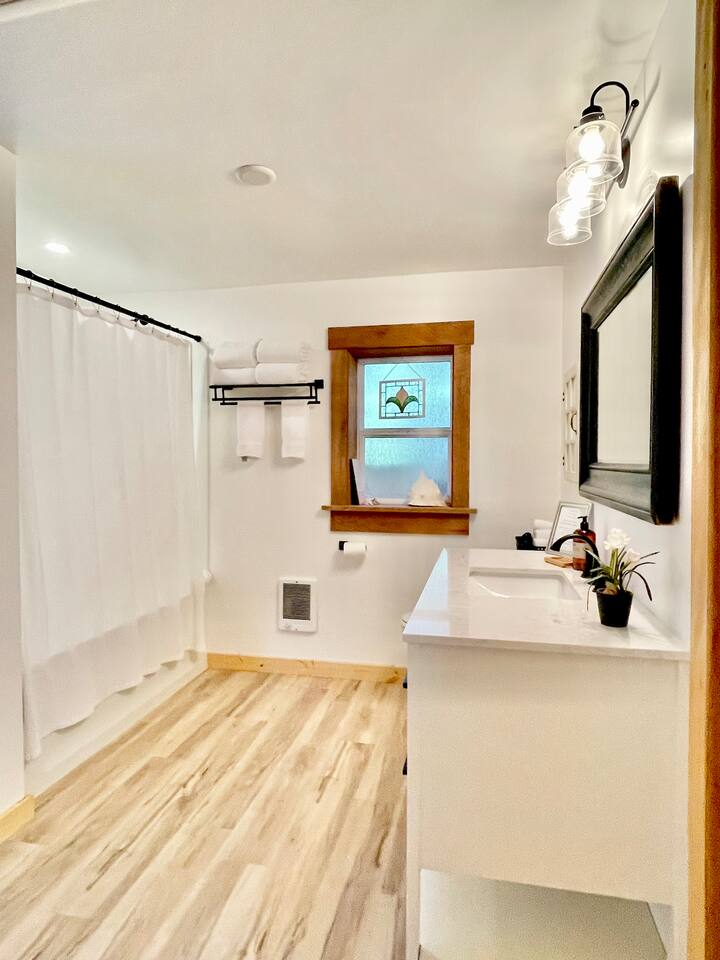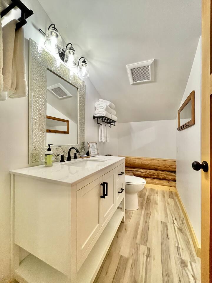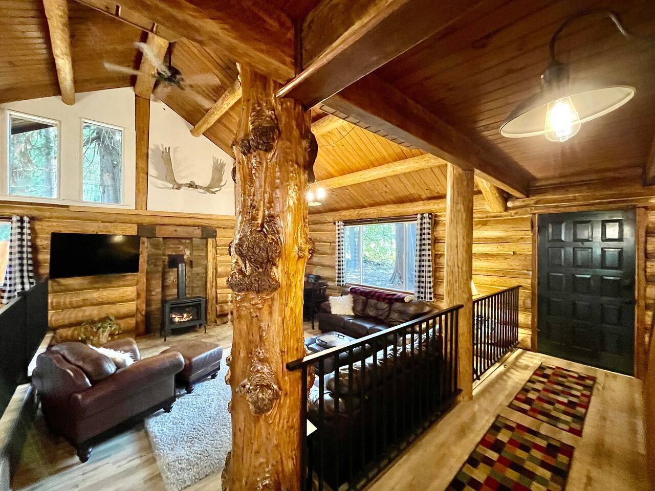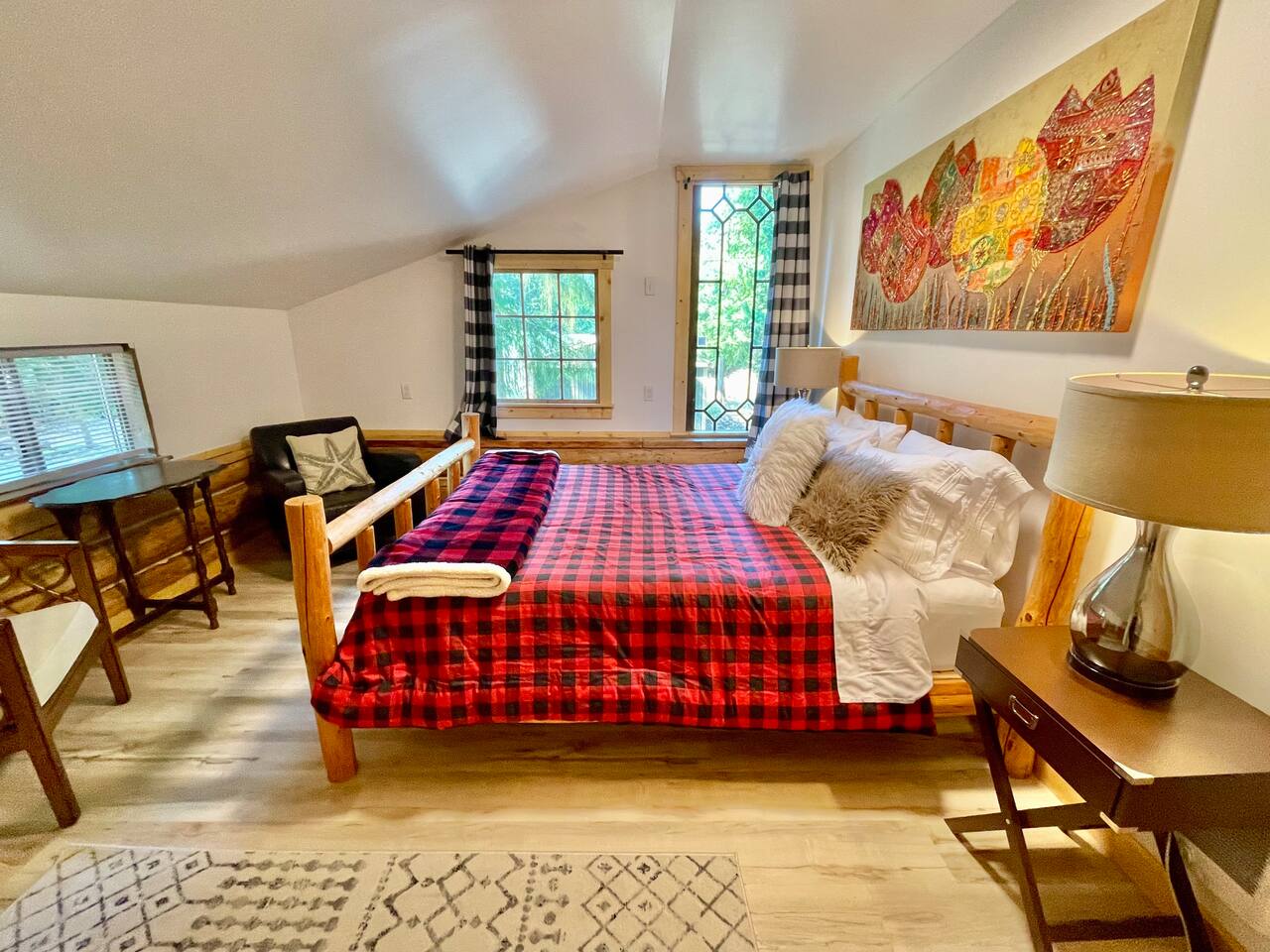 This renovated deluxe log cabin was built in the 1970's by hand. It sits on almost an acre of land with lots of beautiful trees. It has been lovingly restored to provide a wonderful relaxing lodge style experience while leaving some rustic charm. MAIN FLOOR... has a sunken living room, large open room with gorgeous logs, beams and hardwood floors. Relaxing comfy couches and leather chair with ottoman. Large dining area with "antler bar" area off the kitchen. BBQ on out the back "dutch" door. Outdoor pic-nic table by the campfire pit. Outdoor dining table and chairs in the trees. Large bathroom with laundry area, king bed in master bedroom with closet and chair. UPSTAIRS... has an open landing that has an extra single bed we call “the nook” and a reading chair with books we call “the library”. The futon chair folds down to a smaller bed. The “Tulip Room” has a queen bed and a 30 inch TV with a firestick. The “Tree House Room” also has a queen bed and a TV with a DVR. Nice brand new bathroom with shower. THINGS TO NOTE: We have an electric fireplace for ambiance - goals of having a propane wood stove in the next few months, possibly adding a hot tub in the future too. We have a TMOBILE hot spot. Works well for phones, tablets and streaming. Part of island life here is that the internet can be spotty at times. There are other location to visit for internet. (Internet is also weak in the IGA grocery shopping center, locals call this area "The Plaza". Internet works well at "Terry's Plaza" where Camano Commons & Bakery are located. We are on septic - and O N L Y a small amount of toilet paper can go down. Nothing else please. In the future we plan to use the large 1200 sf shop for art and music events. Perhaps a painting class, etc. Check back for more information as our plans continue to evolve. CamanoLogHouse.com